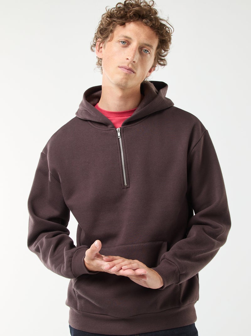 Felpa in tessuto felpato con con cappuccio e apertura sul collo con zip - Marrone