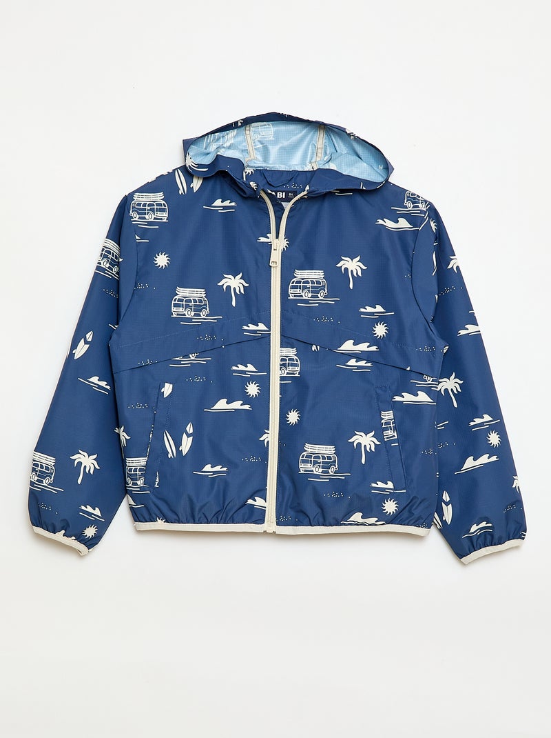 Una giacca a vento con cappuccio progettata per proteggere dal vento e dalla pioggia, con dettagli pratici.