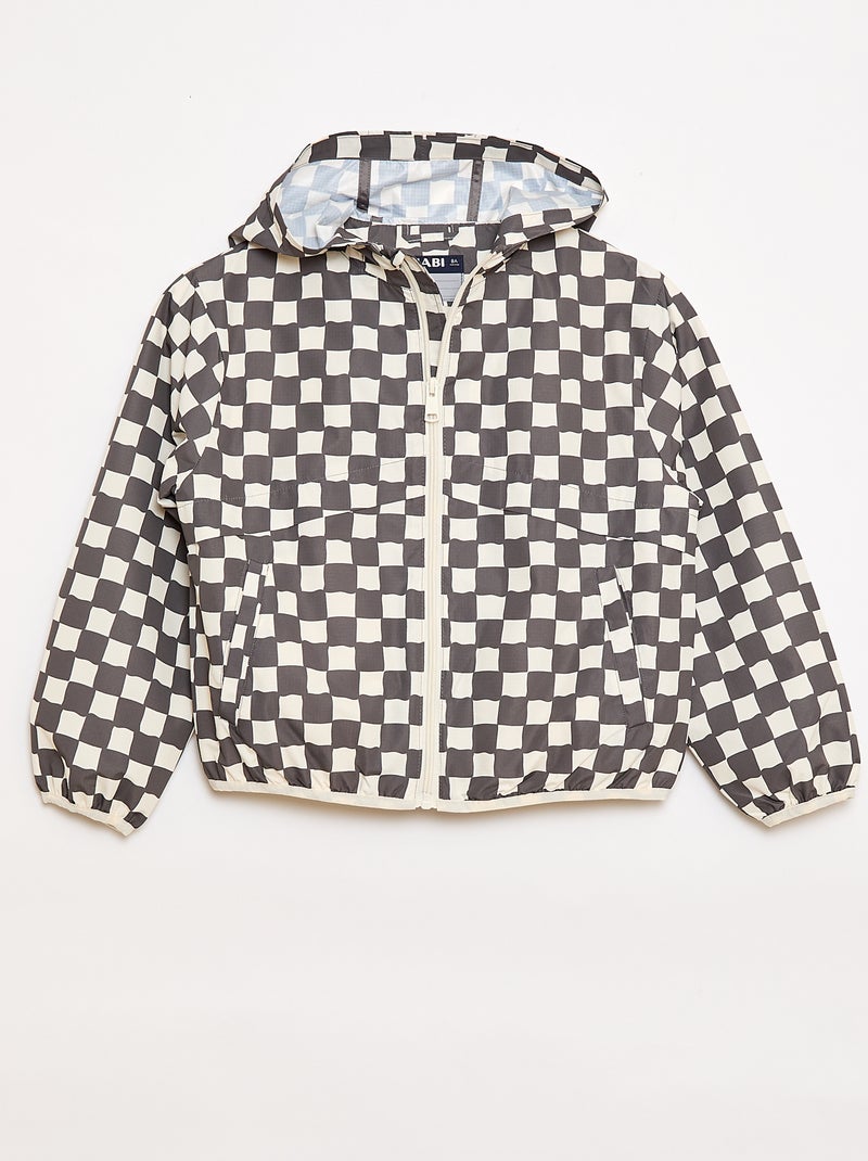 Una giacca a vento con cappuccio progettata per proteggere dal vento e dalla pioggia, con dettagli pratici.
