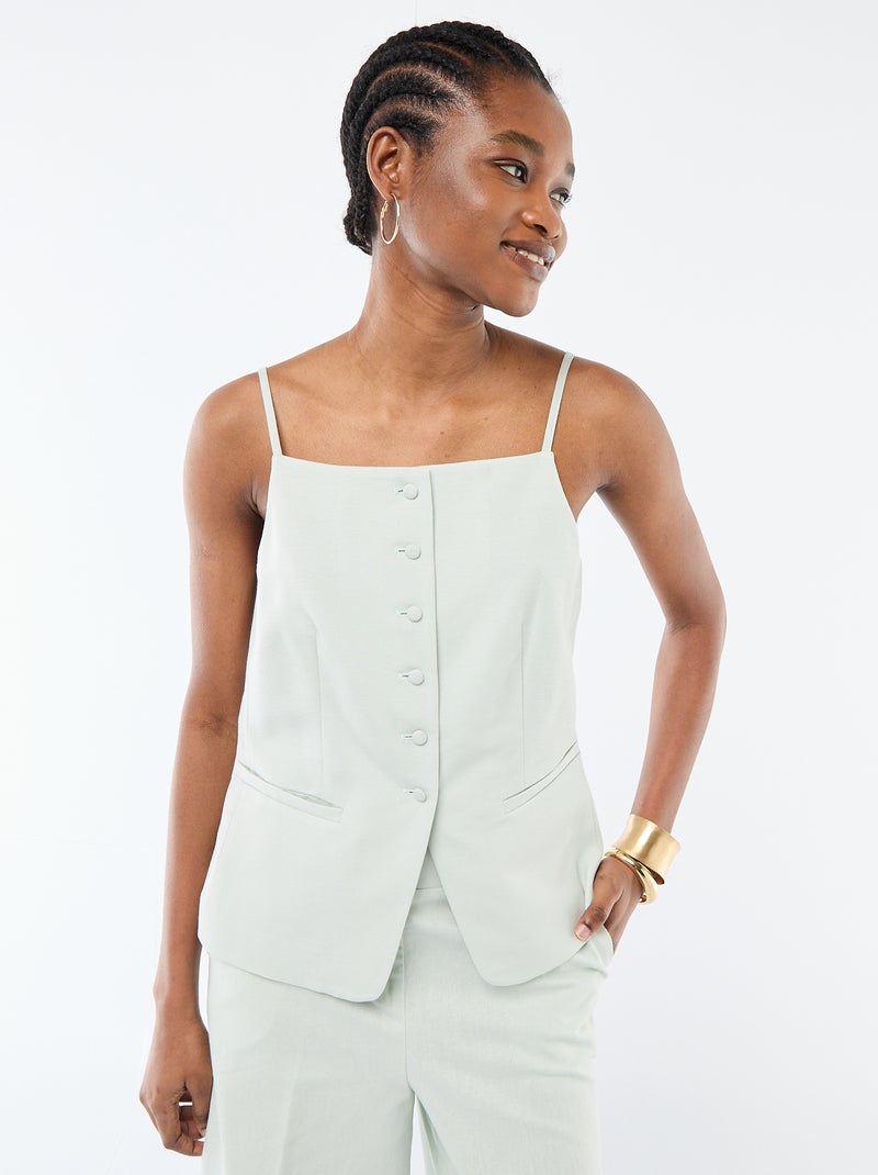 Aggiungi un tocco sofisticato ai tuoi outfit con questo gilet abbottonato con bretelle!
