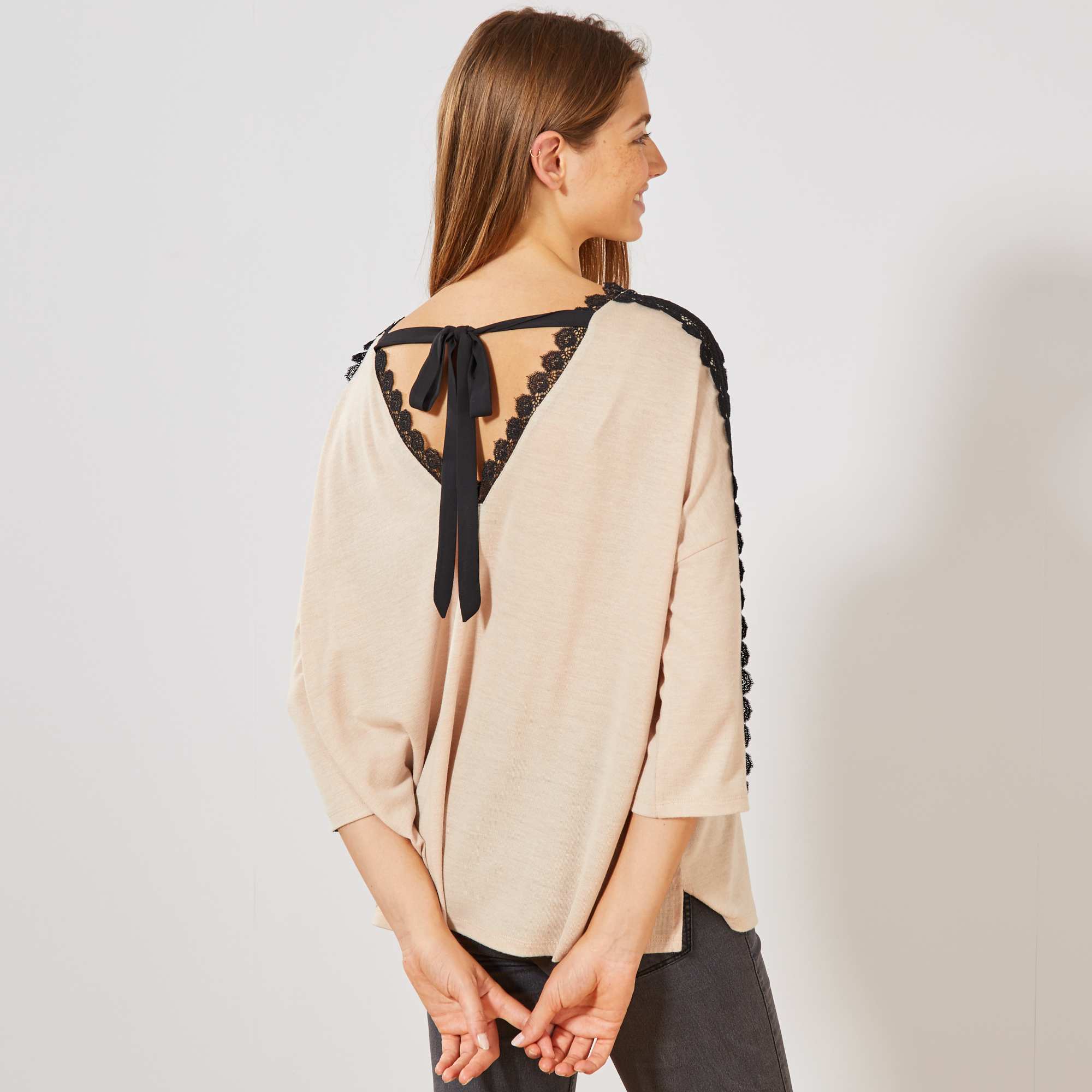 Una maglietta in maglia morbida e calda, arricchita da un bel gallone in pizzo delicato lungo le maniche. Con il dietro annodato, è un capo femminile che si sposa perfettamente con i jeans o i pantaloni eleganti...