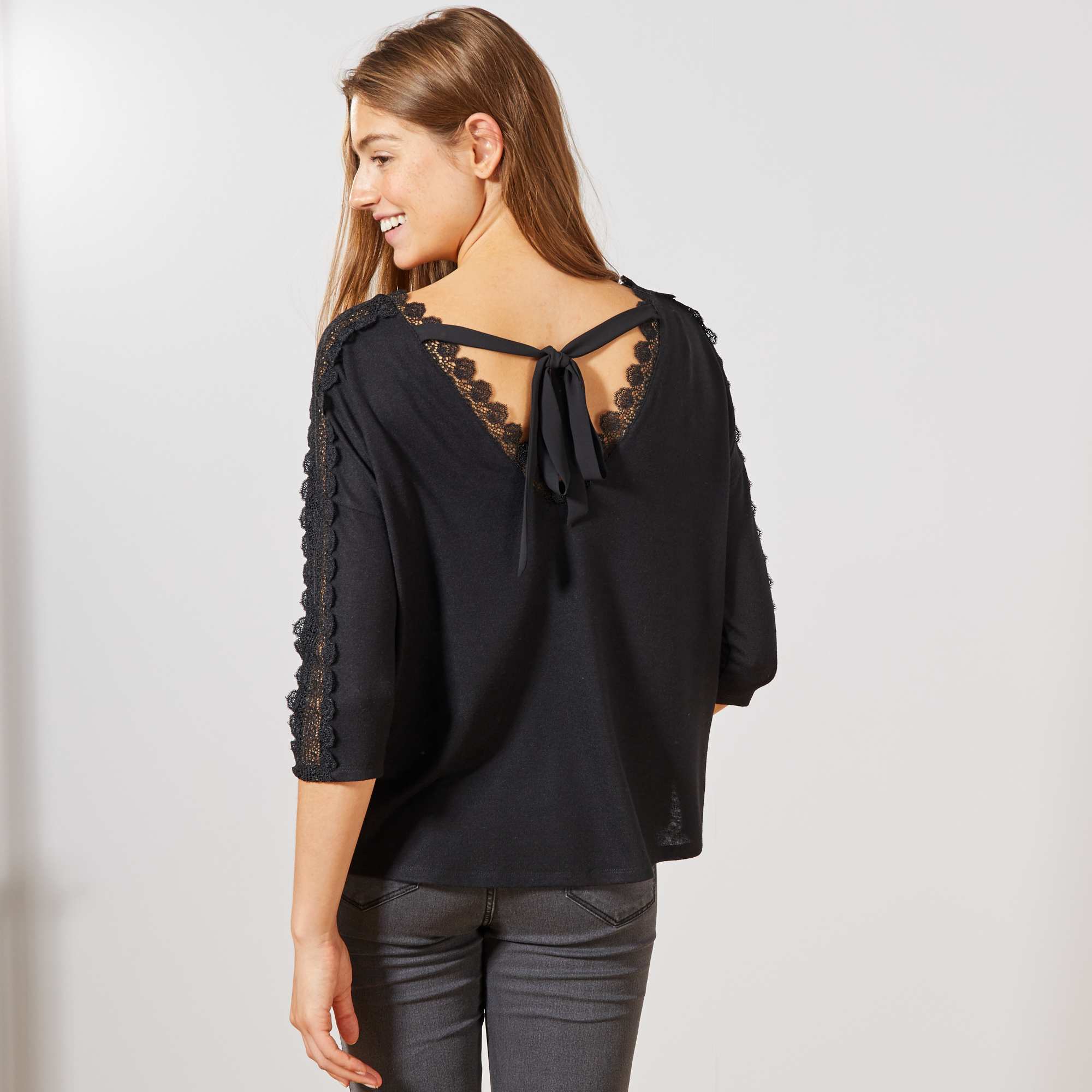 Una maglietta in maglia morbida e calda, arricchita da un bel gallone in pizzo delicato lungo le maniche. Con il dietro annodato, è un capo femminile che si sposa perfettamente con i jeans o i pantaloni eleganti...