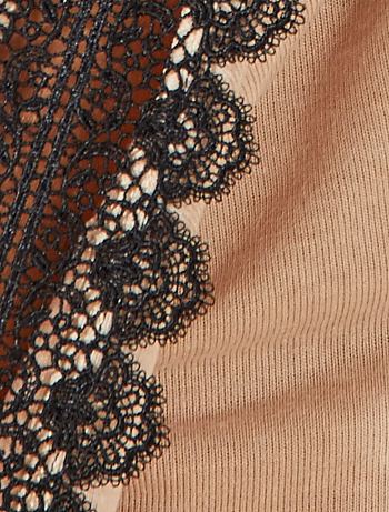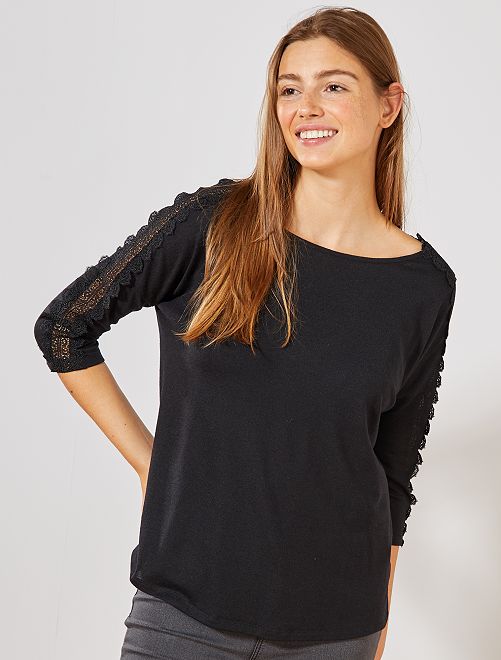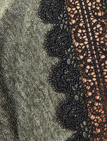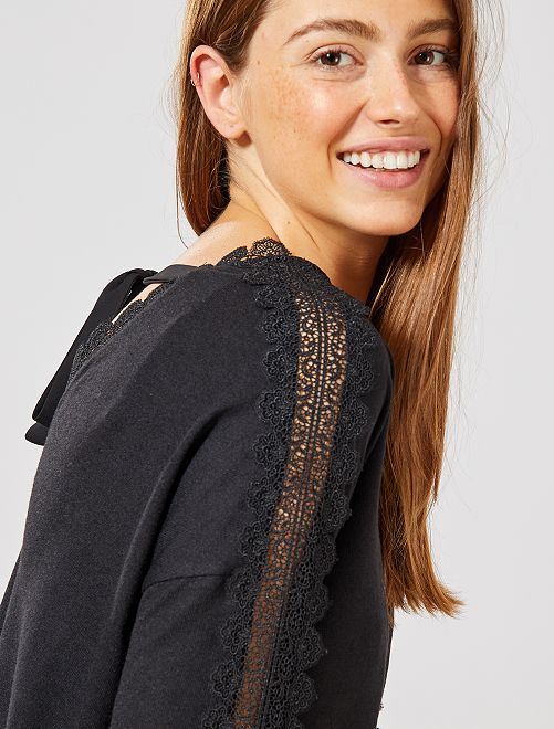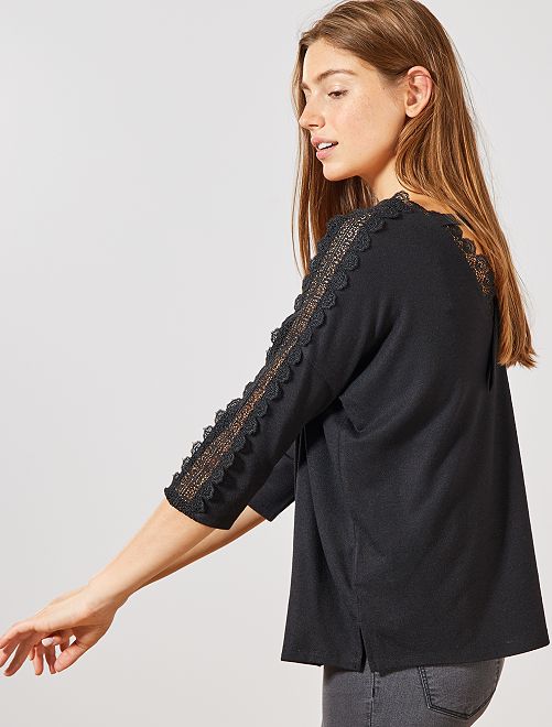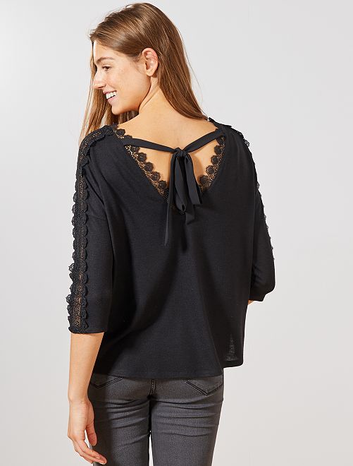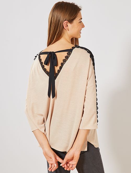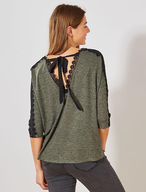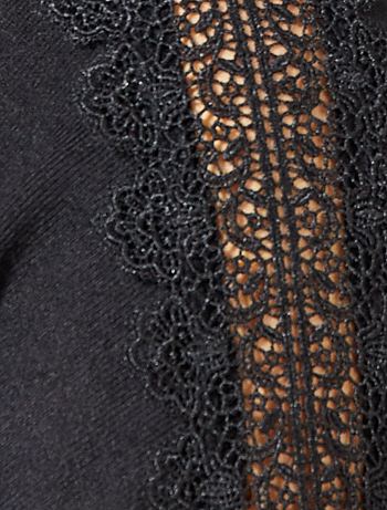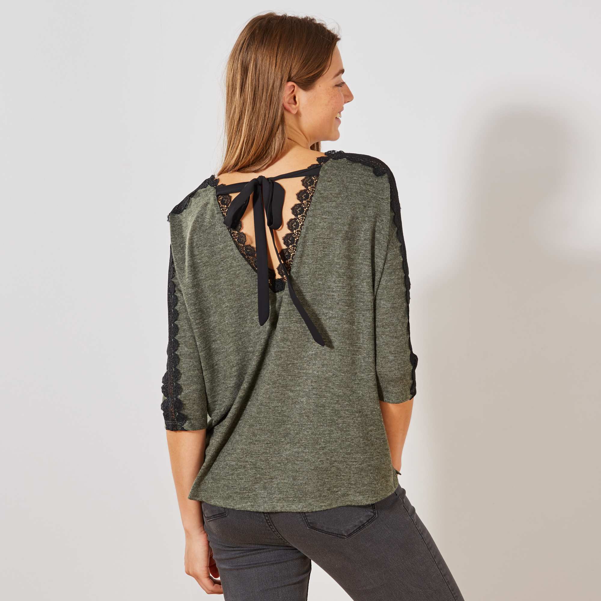 Una maglietta in maglia morbida e calda, arricchita da un bel gallone in pizzo delicato lungo le maniche. Con il dietro annodato, è un capo femminile che si sposa perfettamente con i jeans o i pantaloni eleganti...