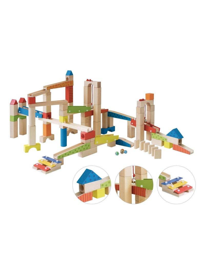 Pista per biglie per bambini – 80 blocchi di costruzione in legno + 20 biglie – "Roba" - Blu Multicolore