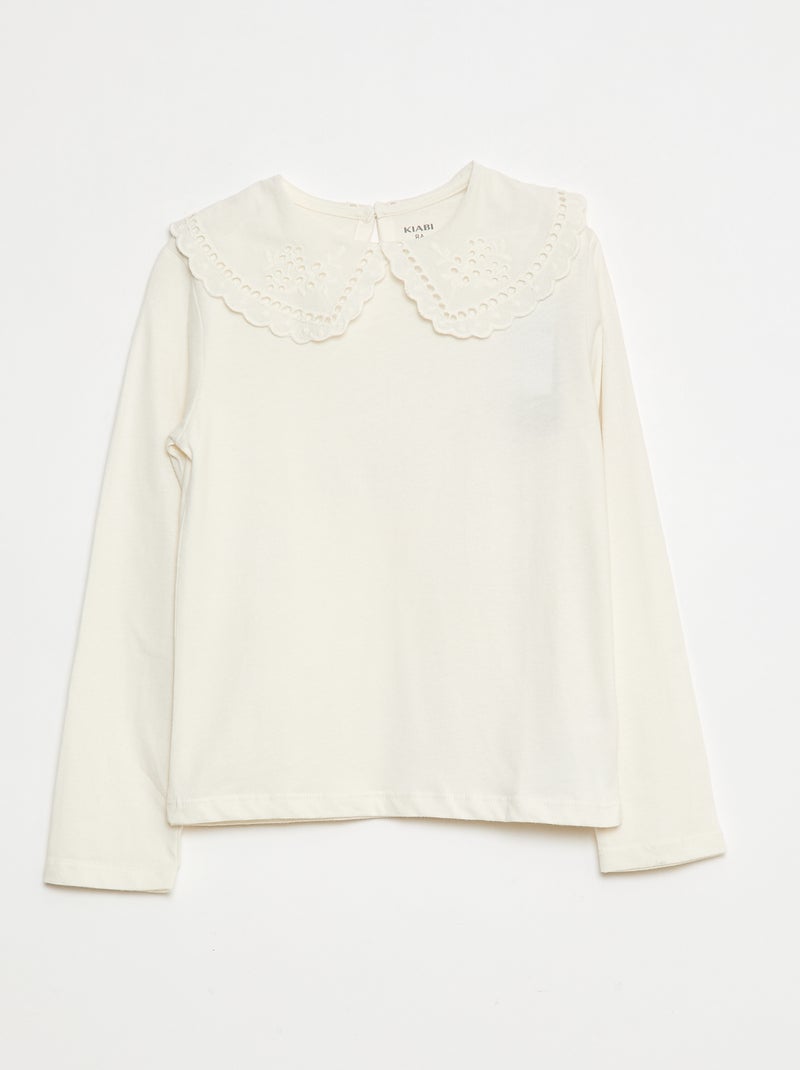 T-shirt in cotone con colletto ricamato - Bianco