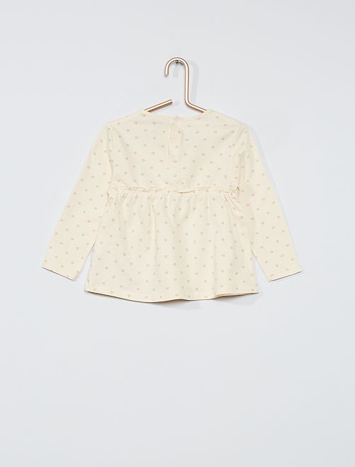 - Volant sotto il petto Con questa nuova linea, Kiabi si impegna con stile nello sviluppo della sua gamma di prodotti 'eco-sostenibili', promuovendo la sostenibilità ambientale nel settore tessile. Questo prodotto è realizzato al 100% in fibre di cotone da agricoltura biologica. Il cotone biologico è coltivato senza semi OGM con compost naturale che sostituisce i fertilizzanti chimici e i pesticidi. Anche tu puoi portare avanti questa iniziativa, lavando i tuoi capi a 30 °C o a freddo!