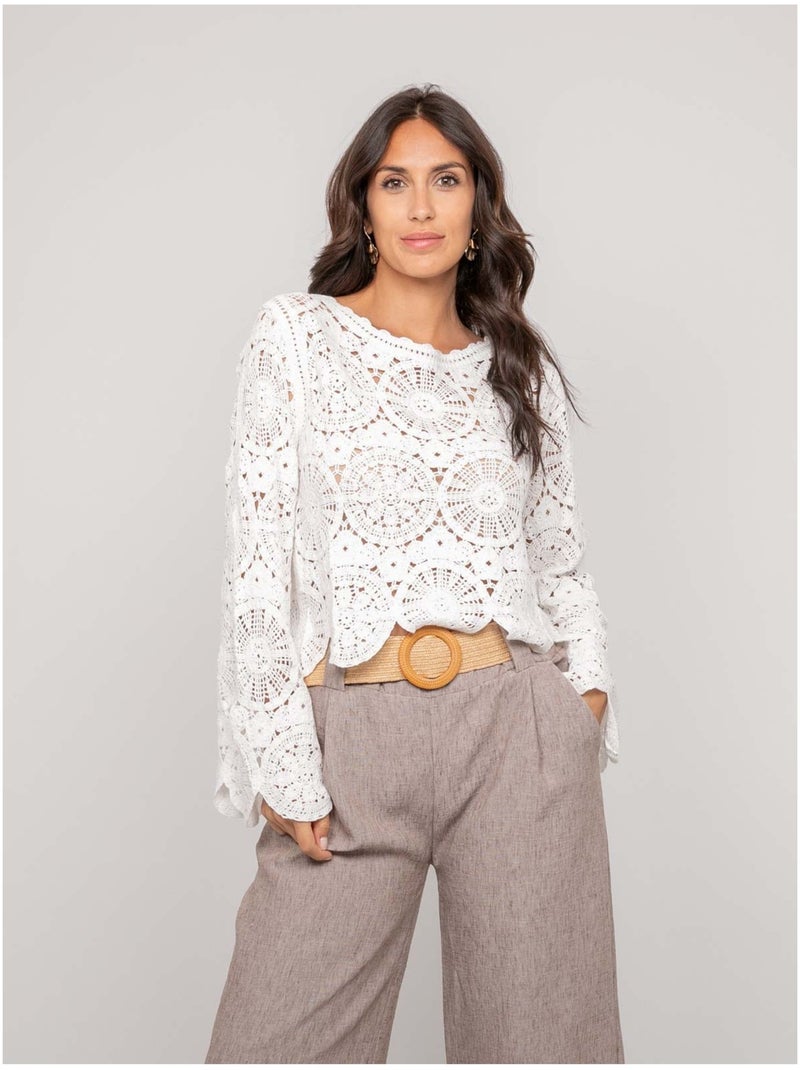 Top a maniche lunghe in pizzo FINARA - Bianco